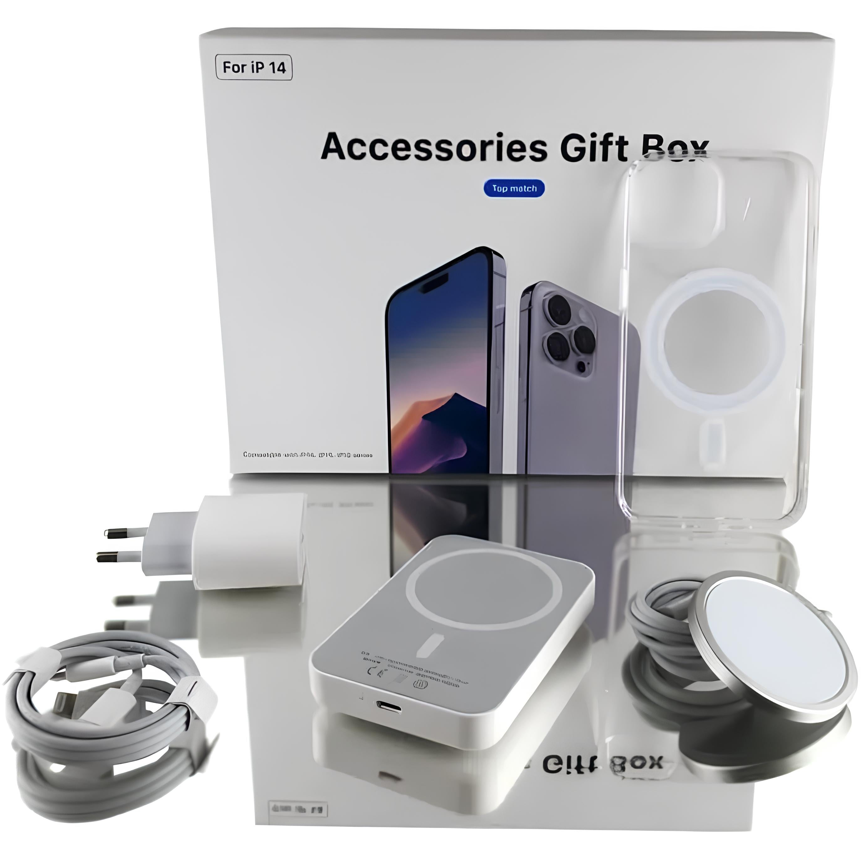 Chaque box contient une sélection soigneusement choisie d’accessoires essentiels : chargeur, câble, chargeur sans fil MagSafe, coque transparente, et autres indispensables, le tout réuni dans un seul coffret élégant. L’objectif est simple : offrir tout ce qu’il faut en une seule box, sans perdre de temps à acheter chaque accessoire séparément.